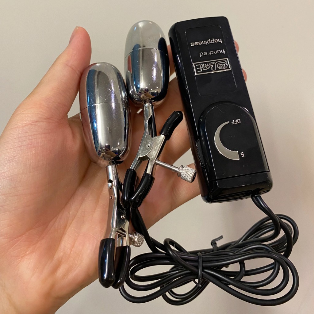 - Sản phẩm gồm 2 bộ phận: Điều khiển có dây nối với 2 trứng rung kẹp đầu ti
