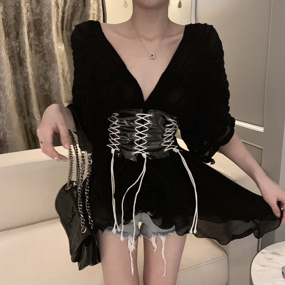 Mẫu đầm với thiết kế tay lỡ, xẻ ngực sâu siêu quyến rũ, kèm đai thắt điều chỉnh dễ mặc vô cùng.